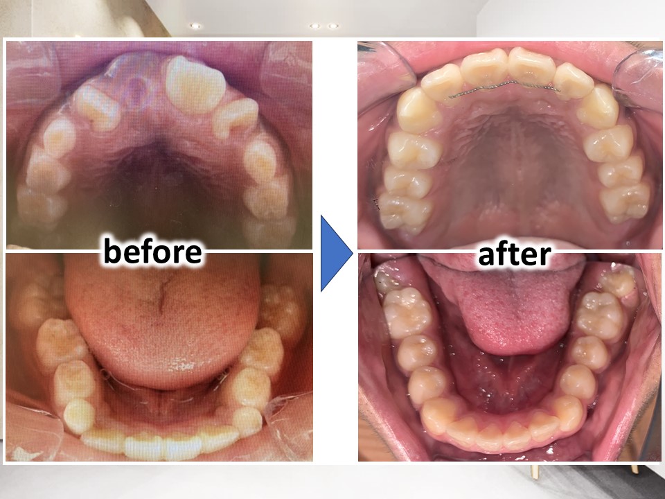 今回は、顎が狭く歯が配列するスペースがなかったため、まずは拡大床にて顎を拡大して歯が並ぶスペースを確保しました。その後、歯のねじれをとるために前歯のみワイヤー矯正を行い、歯の配列を行いました。それと同時に、歯並びを崩した主な要因と思われる口呼吸に対してもアプローチを行いました。矯正治療開始前は、夜寝るときに必ず開いていた口が、矯正終了時には閉じているようになったと、ご両親からは歓びの声をいただきました。
